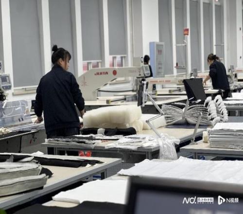 波司登(哈尔滨)科技有限公司服装制造厂内,工人在忙碌着。