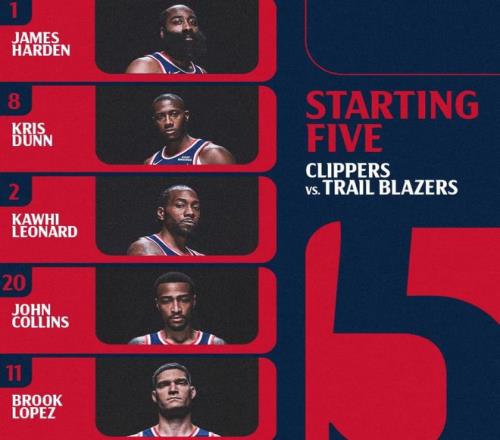 首发阵容方面,快船队这边,祖巴茨、比尔缺阵,泰伦卢教练排出的最新首发五人组为:詹姆斯-哈登、克里斯-邓恩、科怀-伦纳德、约翰-科林斯、大洛佩兹;开拓者队这边,亨德森、格兰特、霍勒迪、利拉德四大主力缺阵,首发阵容则为:夏普、卡马拉、默里、阿夫迪亚、克林根。