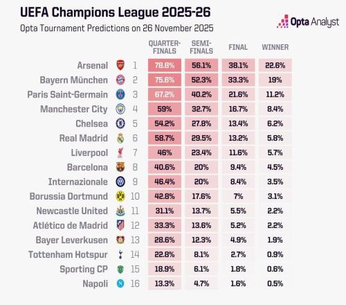 在欧冠联赛阶段前5轮战罢,Opta更新了超级计算机预测的欧冠夺冠概率,阿森纳22.6%领跑,拜仁19%位列第二,巴黎第三...