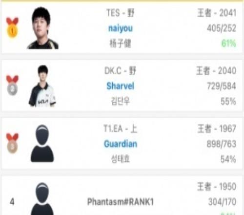 韩服排行榜更新:TES打野naiyou以2041分登顶韩服!
