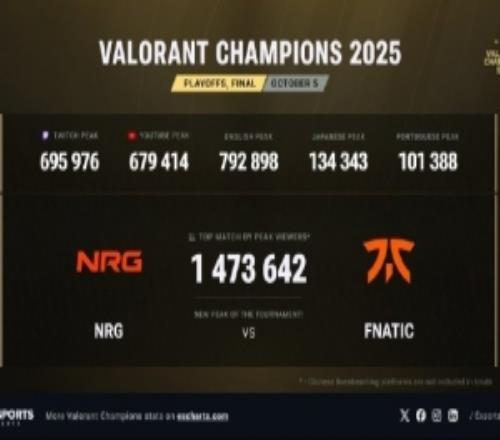 体育资讯10月8日称 据国外Esports Charts数据网站统计,瓦罗兰特巴黎全球总决赛的峰值观众为147w,不及CS2 Major和英雄联盟MSI。
