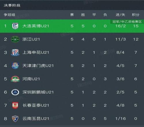 大连英博U21在争冠组5战全胜,5场比赛仅丢两球,积15分,排名第一。联赛仅剩下两轮,如果两个对手是是天津津门虎和深圳新鹏城,拿下任意一场就将夺冠,会师大连涵瑀,两队争夺一个中乙联赛名额。本场比赛彭顺杰在后卫线上也很稳,几次解围都展现出一名优秀中后卫的潜质。